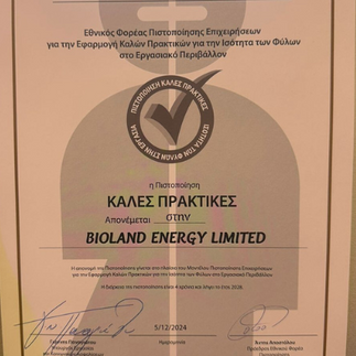 Η Bioland Energy Ltd. έχει τη χαρά και την τιμή να ανακοινώσει ότι πιστοποιήθηκε από τον Εθνικό Φορέα Πιστοποίησης Επιχειρήσεων για την εξαιρετική εφαρμογή Καλών Πρακτικών Ισότητας στον Εργασιακό Χώρο. Η σημαντική αυτή διάκριση απονεμήθηκε χθες σε τελετή που πραγματοποιήθηκε υπό την αιγίδα του Υπουργού Εργασίας και Κοινωνικών Ασφαλίσεων.