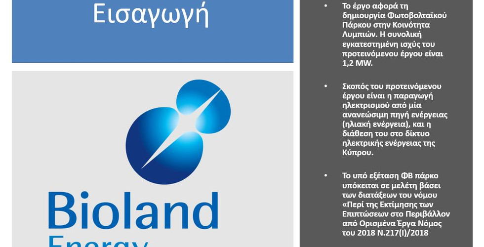 Θα θέλαμε να σας ενημερώσουμε ότι η εταιρία Bioland Project 74 Ltd έχει προβεί σε κατάθεση παρουσίασης Μελέτης Εκτίμησης Επιπτώσεων στο Περιβάλλον από την κατασκευή και λειτουργία φωτοβολταϊκού πάρκου στην Κοινότητα Λύμπια της Επαρχίας Λευκωσίας.